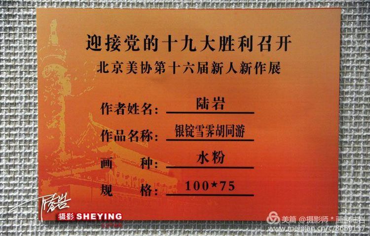 ![]() 目前我的老北京胡同画正在《北京美协第十六届新人新作展》上展出。此画作名为《银锭雪霁胡同游》,纸本水粉画(101×74cm),也是我依据八十年代后期拍摄的北京什刹海银锭桥雪后景致而创作的。 这也是我首次参加由北京市文联、北京市美术家协会主办的画展。此次活动共收集到投稿作品近500幅,本着出人才、出精品、推新人的原则,经过专家初评作品照片、复评作品原作,最终评选出115件优秀作品展出,其中涵盖国画65件,油画35件,雕塑6件,水彩水粉画5件,丙烯和综合材料3件。成功入围的作者将获得活动画册和入选资格证书。 每年一届的新人新作展览活动,旨在发展、繁荣北京的美术事业,凸显北京德泽育人、容载万物的独特城市品格。美术家应当积极弘扬社会主流价值观,坚守中华文化立场,坚持高水准的艺术追求,秉持高尚的道德情操。以传承民族精神、建设和谐文化、实现中华民族伟大复兴的“中国梦”而努力。 谨以北京美协第十六届新人新作展览活动的成功举办迎接国庆,迎接党的十九大胜利召开! 展出地点在北京站东街国艺美术馆,此次活动将持续6天,于2017年9月20日——9月26日在国艺美术馆展出,期间免费对社会公众开放。 ![]() ![]() ![]() ![]() ![]() ![]() ![]() ![]() ![]() ![]() ![]() ![]() ![]() 陆岩(网名/胡同绘影) 本人中国农工民主党党员;中国美术家学会会员;中国摄影家协会会员;新华社签约摄影师;中国空军八一飞行表演队特邀摄影师;天安门国旗护卫队特邀摄影师;北京市文物局艺术顾问。 本人于1997年被中共中央宣传部写信给予表彰。 本人毕业于清华大学美术学院装潢设计系。自70年代起曾从师于娄师白等国画大师。曾从事过商业美工、美术编辑,平面广告设计师等工作。绘画及摄影工作已有四十多年,擅长绘画、摄影、写作、旅行等。 本人擅长水粉画、丙烯画、国画山水、钢笔速写、广告装潢设计等。 本人1988年设计的《中华服饰文化博览会》海报(一组四张)入选“世界海报一百强”,并在国家博物馆和台湾获奖展览。本人90年代设计过大量的集邮品,其作品多次被国家邮政局全国各地邮政机构所采用并获奖。2016年3月在河南郑州举办了《陆岩胡同记忆画展》,本人的国画《军礼》2017年7月在北京卢沟桥参加《抗日烽火从这里燎原》。多年来其绘画与设计作品曾多次在中国美术馆和国内等地展出。本人近年来以其写实风格创作了大量的以北京老胡同为题材的绘画作品,其作品被港澳台及国外众多企业与个人收藏。所拍摄的北京老胡同作品多次被国家旅游局等多家出版社出版了专题画册和明信片。 本人是网易博客千万名博,曾获得2012和2013年度网易、凤凰网十佳博主称号。 本人曾为多国政要和名人、企业以及国家多个重大国事活动等拍摄了近百万张片子。三十年来本人走遍祖国各地,撰写了数十万字的文章。 网易博客:http://caidan58.blog.163.com/ QQ:847266533 (胡同绘影) E-mail:caidan2415@163.com ![]() |