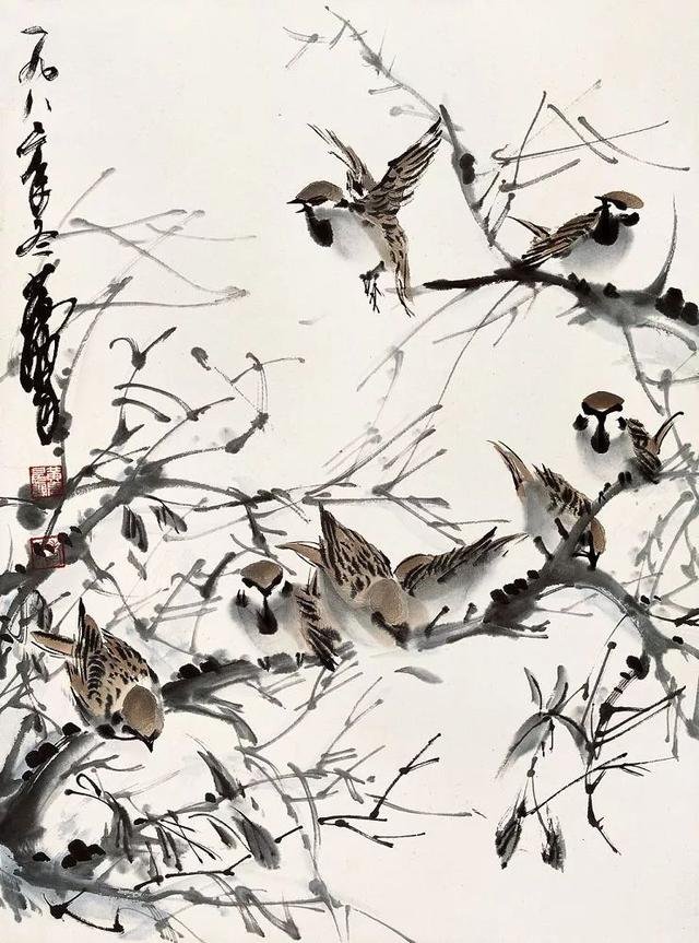 在表现事物飞舞、奔跑、转动等动态时,黄胄才会用复笔。对于面部五官是不用复笔的。复笔的运用对整个画面产生强烈运动感,烘托热烈氛围,造成满壁风动的效果是很有好处的。 |