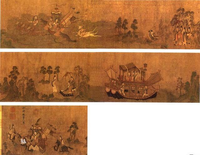 中国十大传世名画之一。原《洛神赋图》卷,东晋著名画家顾恺之绘制(宋摹),绢本,设色,纵27.1cm,横572.8cm。这幅画根据曹植著名的《洛神赋》而作,为顾恺之传世精品。全卷分为三个部分,曲折细致而又层次分明地描绘着曹植与洛神真挚纯洁的爱情故事。此图卷无论从内容、艺术结构、人物造形、环境描绘和笔墨表现的形式来看,都不愧为中国古典绘画中的瑰宝之一。 女史箴图