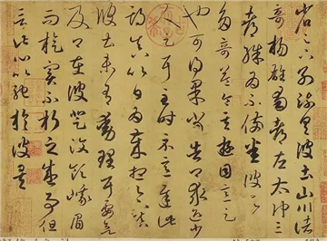 墨迹本《游目帖》 3、刻本中的字势很多比墨迹本强,不少字攲侧幅度略大,如第一个“省”字,刻本略左倾,墨迹本平正。就这一点点差别,增加了灵动性。在如在结体上,刻本变化更多,如“備”“得”“理”“驰”等左右结构的字,刻本中多作上下错落处理,而墨迹本则是齐的。“领”字,刻本左边笔画粗重,右边空灵。墨迹本则用笔左右对比不强烈。 4、节奏,刻本节奏更强烈一些,体现在对字组的运用上,刻本也比墨迹本好,比如“杨雄蜀”三字、“当告”二字本来一组,一气呵成,赵孟頫就临本完全没有了。土、山、川三字刻本更拙朴,特别是川字。