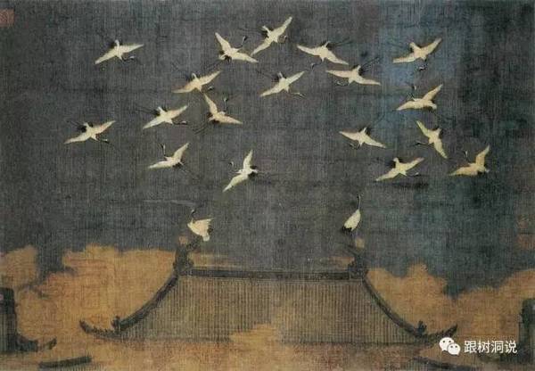 大气的《瑞鹤图》,藏于辽宁省博物馆,此图绘彩云缭绕之汴梁宣德门,上空飞鹤盘旋,鸱尾之上,有两鹤驻立,互相呼应。画面仅见宫门脊梁部分,突出群鹤翔集,庄严肃穆中透出神秘吉祥的气氛。而且一改常规花鸟画构图的传统方法,将飞鹤布满天空,一线屋檐既反衬出群鹤高翔,又赋予画面故事情节,此在中国绘画史上是一次大胆尝试。