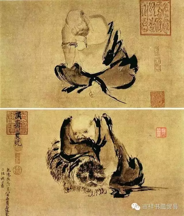 《二祖调心图》 宋 石恪 纸本水墨 35.5cm×129cm 日本东京国立博物馆藏 石恪,五代末宋初画家。字子专,成都郫县(今属四川省)人。图中表现慧可、丰干二位禅宗祖师调心师禅时的景象。慧可为禅宗二祖。画卷中,双足交叉趺坐,以胳膊支肘托腮的便是慧可,另一幅画丰干坐于温驯如猫的老虎的背上。